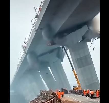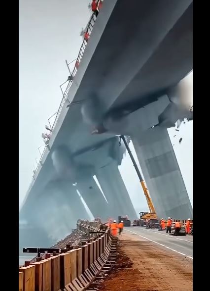 The scene captures the tense, real-life urgency of trained workers evacuating before a catastrophic collapse