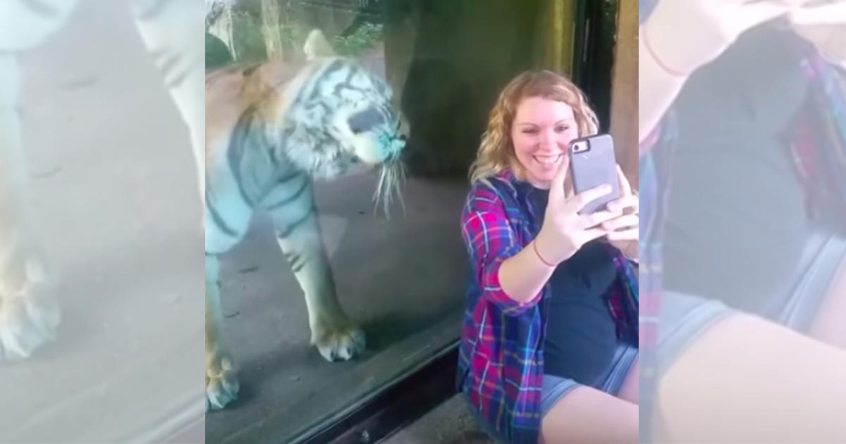 They couldn’t overlook how interested the tiger was in Brittany’s belly. Brittany decided to stand up close next to the glass. Take a look at what the tiger did next.